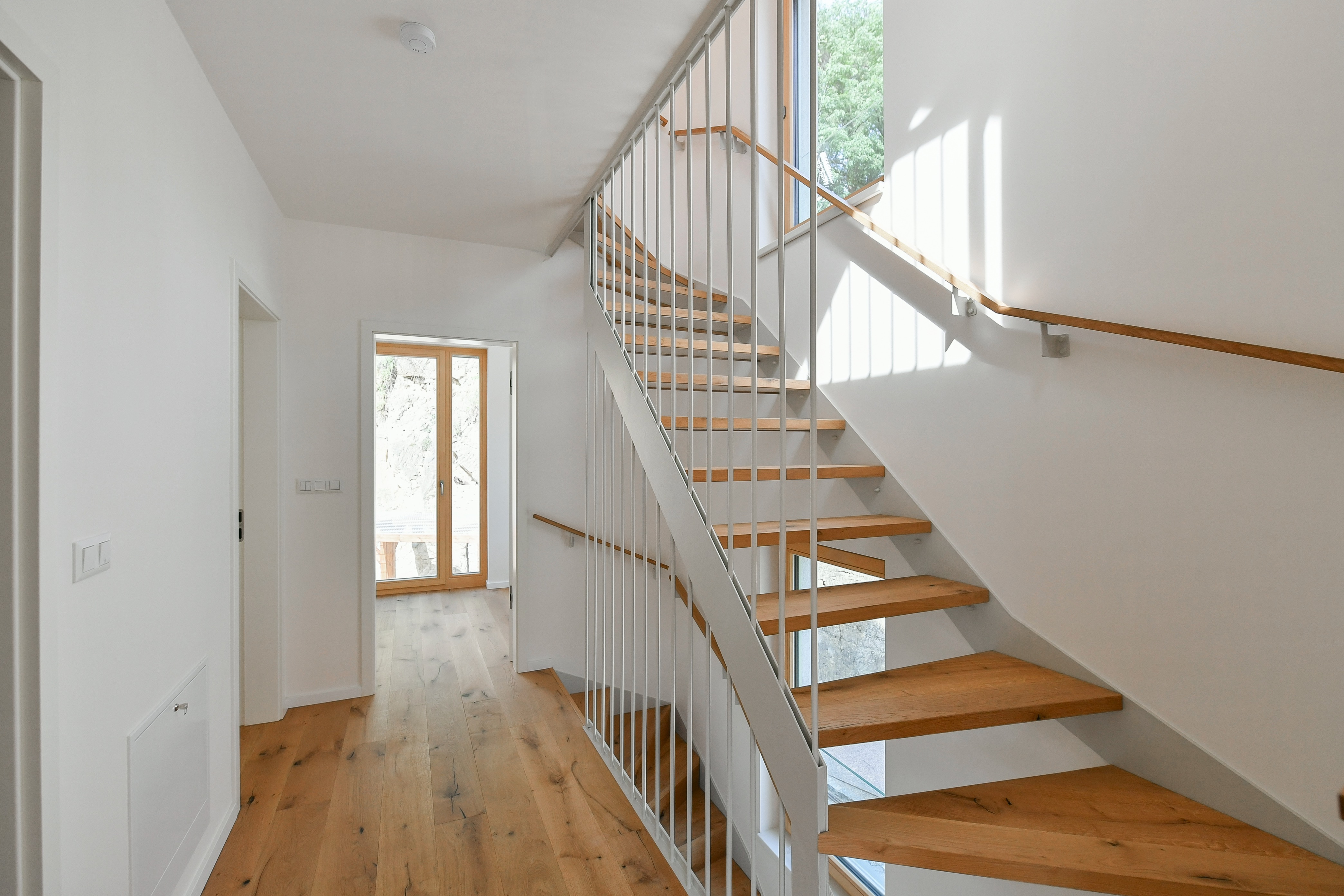 Apartment No. 6 is a very quiet and sunny ground-floor apartment with many French windows and direct access from most rooms to a spacious front garden/terrace of approx. 25m2. There is another 31 sqm of plot which belongs to the unit (attached to the unit) and can be used as a garden or outdoor parking spaces. The apartment is entered either from the garage via the elevator to the entrance hall or through the main entrance to the building from Sestupná street, and the owner can receive visitors directly from the garden.
